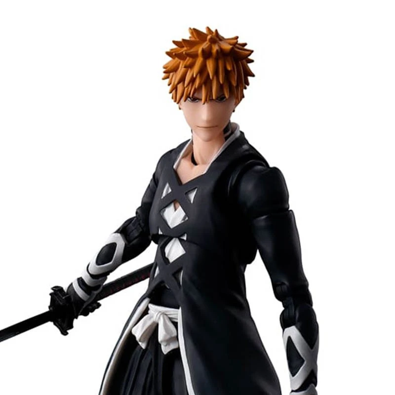 Bleach Figurine Ichigo Kurosaki Bankai version dans la gamme S.H Figuarts du fabricant Bandai Tamashii. Figurine Bleach entièrement articulée, taille: 15 cm avec de nombreux accessoires d’Ichigo dans sa version Bankai
