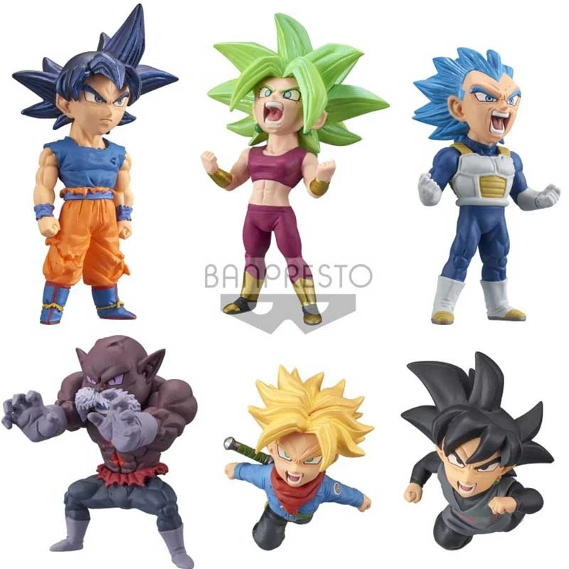 Dragon Ball Super Set de 6 Figurines dans la gamme WCF Battle of Saiyans du fabricant Banpresto. Collection de six mini figurine en PVC, taille : 7 cm de Goku, Vegeta, Goku Black, Toppo, Caulifla et Trunks.