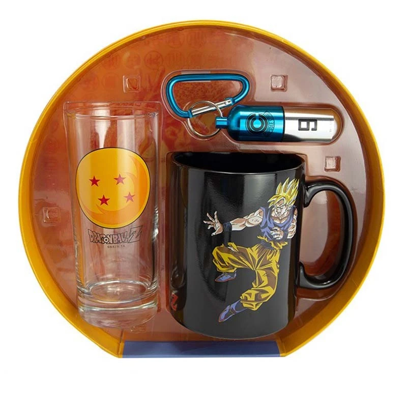 Dragon Ball Z Coffret cadeau DBZ. Faite plaisir à un fan de Dragon Ball avec ce coffret cadeau qui reprend la célèbre boule de cristal du manga. le coffret contient un porte clés Capsule Corp, un verre Dragon Ball et un mug Thermo-réactif Goku vs Buu.