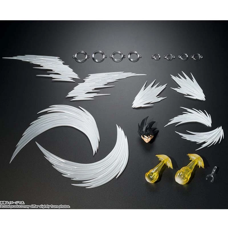 Set d’effet pour la S.H.Figuarts de Goku. Inclu en bonus 1 tête pour la S.H. Figuarts Son Goku -A SAIYAN RAISED ON EARTH-(vendu séparément.) [Set Contents]Kick effect parts (L/R) x2, Punch effect parts (L/R) x2, Punch, Kick Attachment parts x8, Energy ball effects (2 types), Energy ball attachment parts,