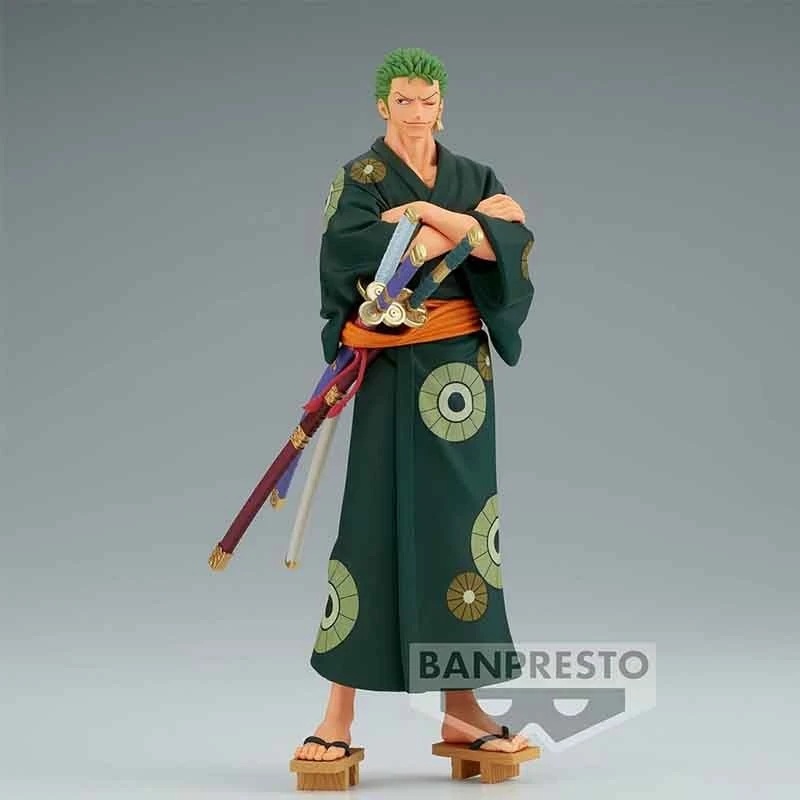 One Piece Figurine Roronoa Zoro Wano yukata dans la gamme DXF The Grandline Series du fabricant Bandai Banpresto. Figurine One Piece en PVC, taille : 17 cm de Zoro.
