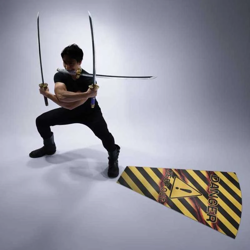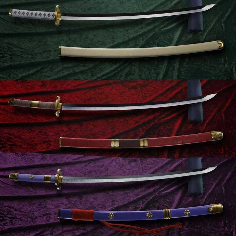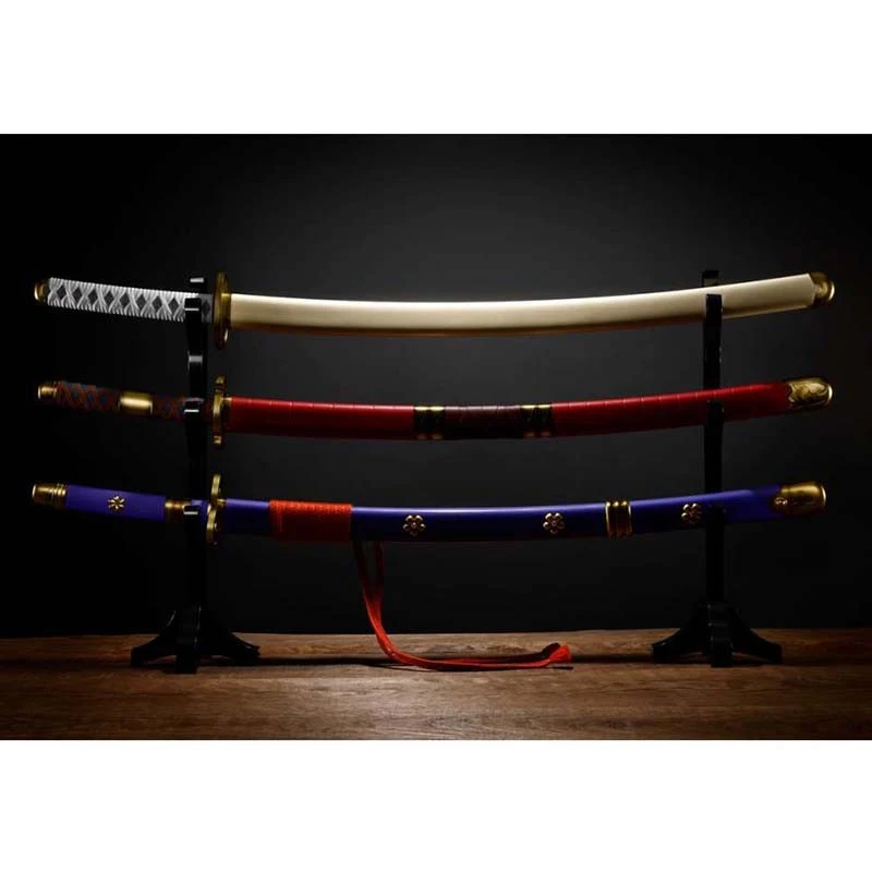 Ces épées à taille réelle sont conçues pour être fidèles à celles de l’anime. La Wado Ichimonji est livrée avec une poignée interchangeable, vous permettant de la tenir dans votre bouche pour reproduire à la perfection le célèbre combat à trois épées de Zoro.
