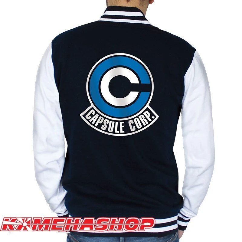 Veste Dragon Ball Z Capsule Corp. Veste molletoné à col montant, bouttons pressions US façon teddy Baseball. adotptez le styl de Trunks avec cette superbe veste Capsule Corp